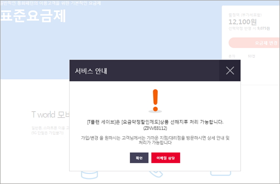 SK텔레콤 이동통신사를 사용 중 인데 티월드 사이트에서 표준요금제로 변경 할려고 보니 '요금약정할인제도상품 선해지후 처리 가능합니다.'라고 창이 뜨면서 안되더군요.