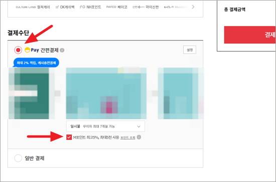 PC에서 크롬 또는 엣지로 Pay 간편결제 주문 시에 현대카드를 선택하면 아래 그림처럼 M포인트(최고5%)선택난이 보여서 체크표시 하고 결제하면 엠포인트를 사용할 수가 있습니다.