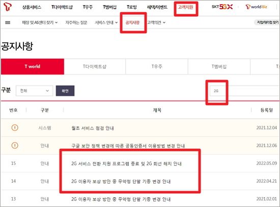 SK테레콤 티월드 홈페이지 고객지원 -> 공지사항에서 '2G'로 검색을 해보면 아래처럼 전환 혜택(무료제공 기기 등) 정보들을 확인 할 수가 있었습니다.