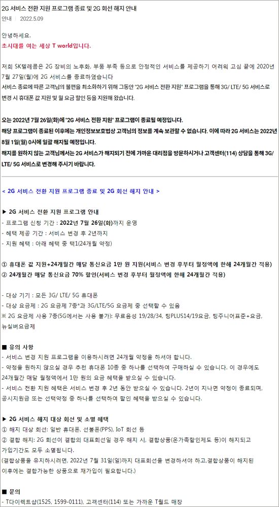-2G 서비스 전환 지원 프로그램은 2022년 7월 26일(화)까지 운영