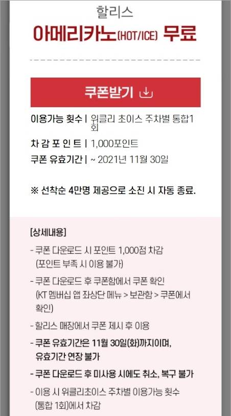 KT멤버십 위클리 초이스(포인트차감) 선착순 할리스 아메리카노 무료, 파리바케트 할인쿠폰 등