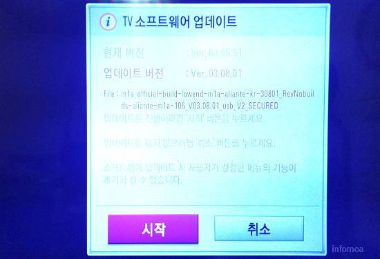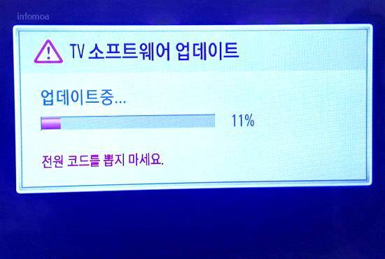 TV 뒷면에 표시된 모델명으로 검색해서 소프트웨어 최신 버전의 파일을 다운 받아서 압축을 풀고 USB 메모리에 저장한 후 TV USB 단자에 꽂으면 자동으로 업데이트 창이 뜹니다.