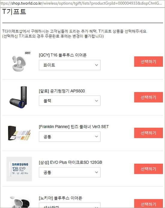 T기프트(사은품)도 받을 수 있었습니다. (블루투스 이어폰 등 다양한데 하나 선택)
