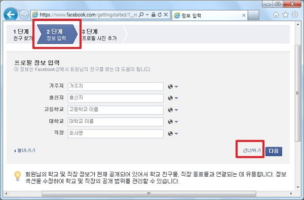 2단계는 정보입력 단계로 페이스북 친구들에게 보여질 거주지, 출신지, 고등학교, 대학교, 직장 등을 적어줍니다.