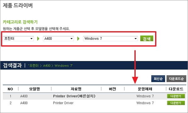 그러면 아래처럼 제품을 검색할 수 있는 페이지가 뜨는데 제품군(복합기, 팩시밀리 등), 모델명(a401, n600, d410, d411 등), 운영체제(window7, xp, 64bit 등)를 선택하고 검색을 누르면 하단에 해당모델에 맞는 드라이버들이 나타납니다.